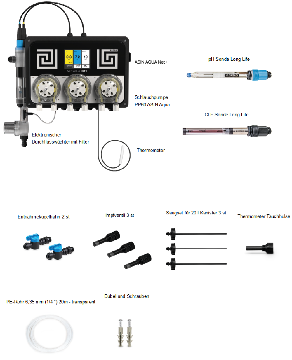 Die Dosierstation Aseko Asin Aqua Net+ CLF ist eine Automatik zur Dosierung von Poolchemie zur Wasseraufbereitung in privaten Schwimmbädern, geeignet für die Verwendung in Schwimmbecken und Whirlpools mit einem Volumen von bis zu 250 m3. Sie ist mit einer CLF-Sonde zur Messung des freien Chlors und einer pH-Sonde zur automatischen Regulierung des pH-Werts ausgestattet. Das Gerät bietet grundlegende Funktionen zur Steuerung der Pooltechnik, die die Anforderungen des täglichen Betriebs von Privatschwimmbädern erfüllen. Es verfügt über einen installierten LAN-Anschluss zur Internetverbindung. Mit der iPool LIVE-App auf dem Mobiltelefon können Sie alle eingestellten Wasserqualitätswerte im Pool sowie Ereignisse, die mit dem Betrieb des Pools und der Chemiedosierung verbunden sind, überwachen.