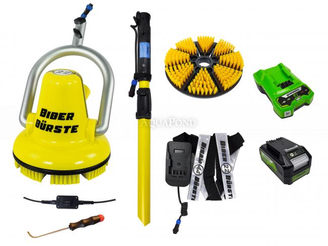 Die neue BIBER 22 BÜRSTE Akku-Variante ist eine elektrische Rotationsbürste mit Absauganschluss und Teleskopstange 2,5 - 5,0m. Die Stromversorgung samt Li-Ion Akku, Kabel und Schalter ist baugleich zur BISAM BÜRSTE 44, dadurch ergibt sich ein kompatibles System das dem Nutzer den Betrieb beider Geräte mit nur einem Versorgungsset ermöglicht. Während die BISAM BÜRSTE 44 vor allem für die Bodenreinigung gedacht ist, wird die BIBER BÜRSTE 22 überwiegend für die Reinigung von Wänden eingesetzt. Die verwendete, völlig neue Vacugrip-Bürste gibt den während des Bürstenvorgangs gelösten Schmutz durch die Bürste selbst über den Saugschlauch ab. In Verbindung mit einem Schlammsauger wird die Bürste soweit selbstständig an die Wand gezogen, sodass ein kraftfreies Bewegen der Bürste über die Teleskopstange erzielt wird. Spoiler oder ähnliche Hilfsmittel sind nicht mehr notwendig. Verschieden harte, schnell zu wechselnde Vacugrip-Bürsten stehen zur Auswahl um auch mit hartnäckigen Verschmutzungen fertig zu werden. Für Besitzer der BISAM BÜRSTE 44 gibt es die BIBER BÜRSTE 22 auch ohne Zubehör. VGB-System: selbständiger Anpressdruck durch Vacugrip-Bürste - reinigen ohne Kraftaufwand