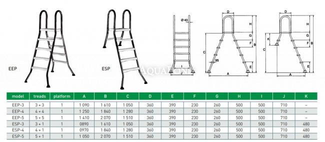 Die Lamellen sind für private Schwimbäder bestimmt. Sie bestehen aus Ocell-Edelstahl AISI 304 mit einem Durchmesser von 43 mm. Die Stufen sind mit Pratiskhez-Stufen versehen. Jede Leiter ist mit einem Stützkegel zur Beckenwand hin abgeschlossen. Der Anker wird mit einem Gehäuse und einer Erdungsklemme geliefert.