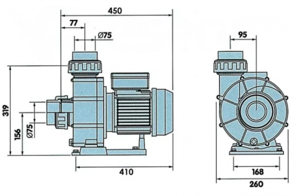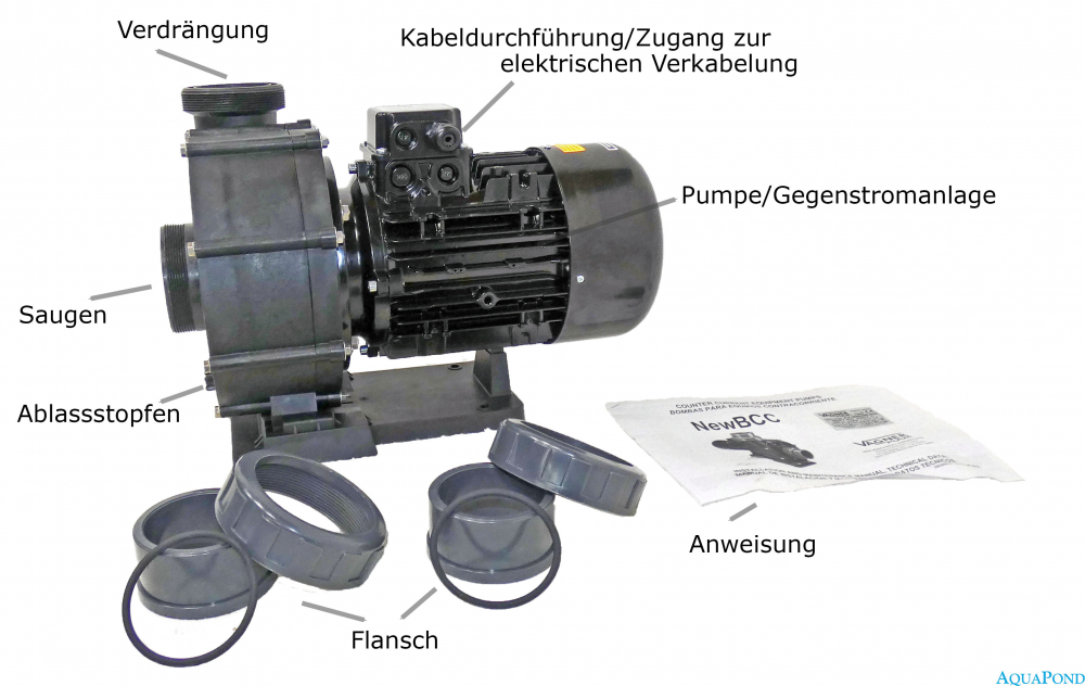 Eine separate Pumpe für den Gegenstrom kann auch als Umwälzpumpe für Wasserattraktionen wie Wasserspeier verwendet werden. Hergestellt aus Polypropylen mit einem Glasfaserzusatz. Der Standort der Pumpe sollte sich in einem trockenen Bereich unterhalb des Wasserspiegels im Pool befinden. Die Pumpe eignet sich zur Vormontage von Vag-Jet- und V-Jet-Gegenströmen.
