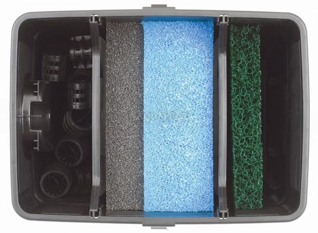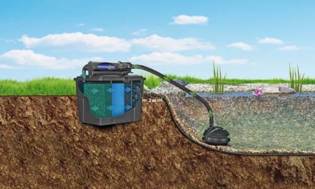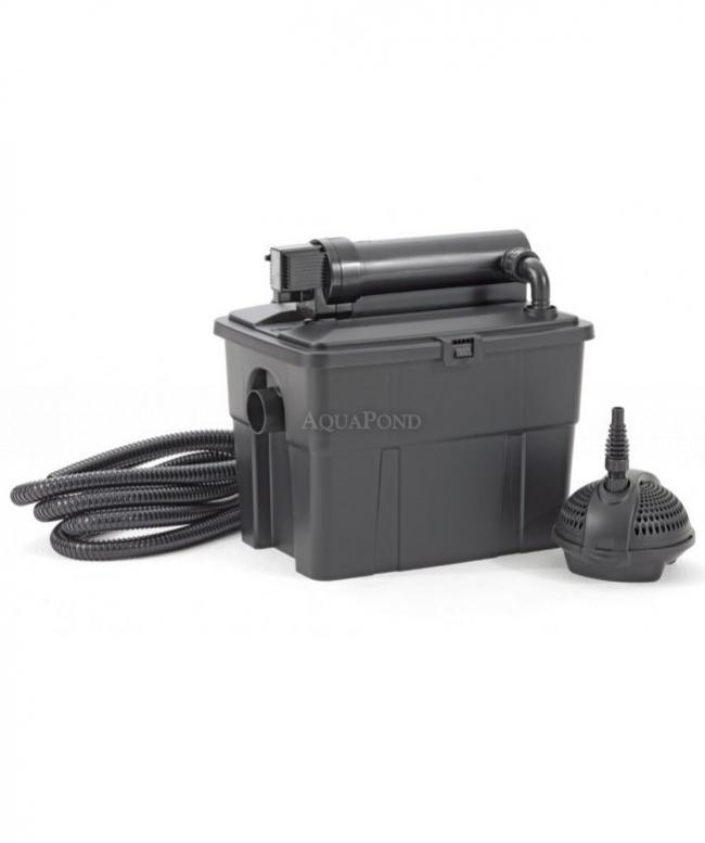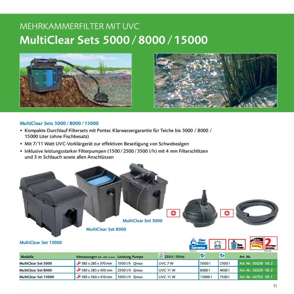 MultiClear Set 5000 ist eine Kompakten Durchlauf Filterset mit Klarwassergarantie für Teiche bis zu 5000 Liter Inhalt. Der Mehrkammerfilter ist mit 4 Filtermedien (Japanmatte, grober und feiner Filterschaum, Bioflächenelemente) und 2 strömungsregulierenden Trennwänden ausgestattet. Das im Filterdeckel integrierte UVC-Vorklärgerät beseitigt effektiv Schwebealgen. Beinhaltet eine leistungsstarke Filterpumpe (2500 l/h) mit 4 mm Filterschlitzen.