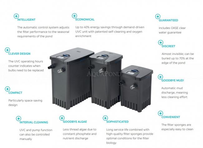 Der intelligente Teichmanager! Der Filter reinigt nicht nur Wasser, sondern auch sich selbst. Dank der permanenten Temperaturmessung des Wassers startet die Steuereinheit selbständig und bedarfsgerecht das integrierte UVC-Vorklärgerät und ermöglicht so echte Stromersparnis von bis zu 40 %. Ebenfalls automatisch aktiviert die Steuereinheit die Schlammpumpe, die den Schmutz aus dem Filter hinausbefördert. Nahezu unsichtbar ist er, da bis zu 70 % am Teichrand eingegraben werden können. Die Reinigung der Filterschwämme geschieht von außen, geeignet für Teiche bis 25 m3.