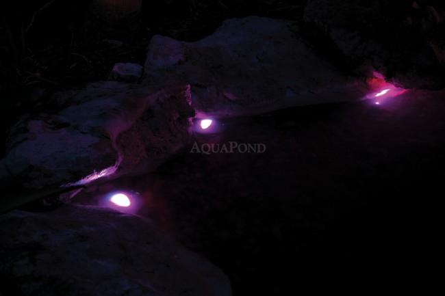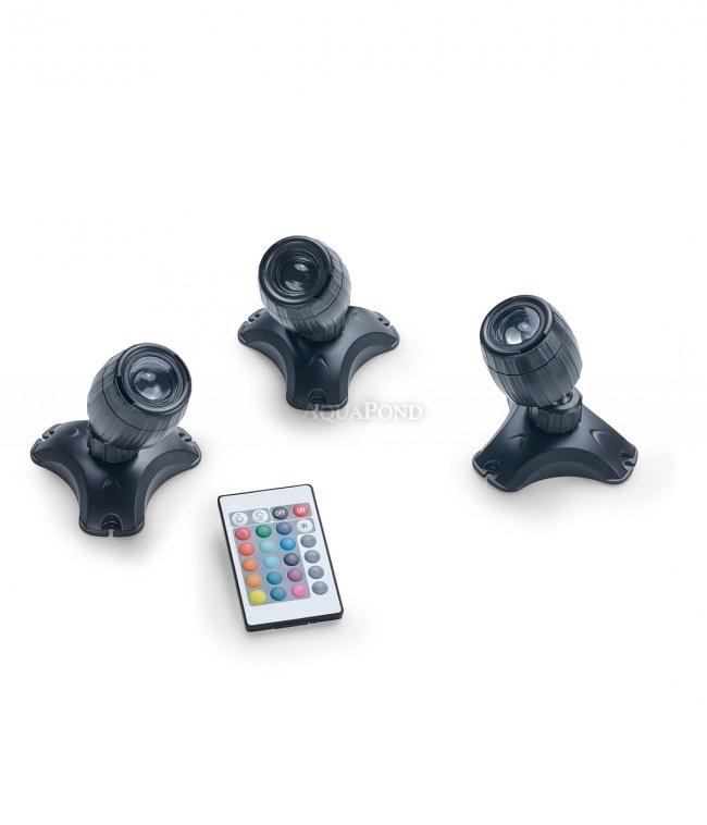 3 effiziente Spots mit Trafo und Fernbedienung für stimmungsvolle farbige und weiße LED-Beleuchtung in Teich und Garten.
