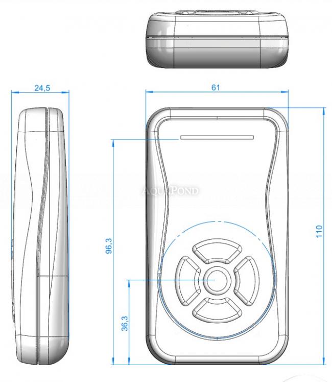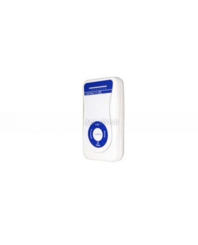 Ermöglicht die Steuerung von maximal 15 Reflektoren. Die Fernbedienung verfügt oben über 8 LED-Statusanzeigen und unten über 4 Tasten: Farbe, Sequenz, Geschwindigkeit, Ein/Aus.