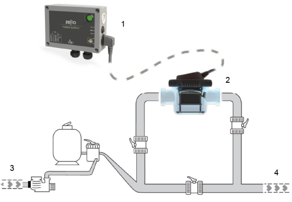Die Zelia ZLT 50 wird mithilfe der mitgelieferten Kupplungen in ein PVC-Rohr mit 50 mm Durchmesser eingebaut. Es wird empfohlen, sie nach der Filtration in einen Bypass einzufügen. Dies ermöglicht: