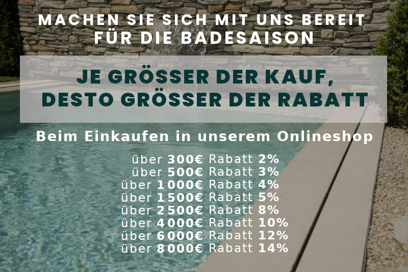 AQUAPOND - günstige Preise, erhebliche Rabatte für Einkäufe über 500 €. Legen Sie die Waren einfach in den Warenkorb und der Rabatt wird entsprechend der Höhe des Einkaufs berechnet. Je grösser der Einkauf, desto grösser der Rabatt.